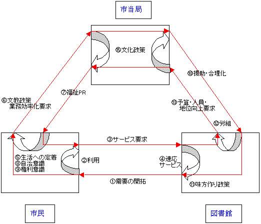 <図書館>が市民生活の中に定着してくると(5)、<利用者>の要求も多様化・高度化するが、<図書館>で満足されない分は<市当局>の方へ文教予算要求や業務効率化要求として向けられる(6)。これを受けた<市当局>は<図書館>に援助を与え(10)、福祉PRを展開できる(7)。これがさらに自治意識・権利意識を育てる(8・9)。
